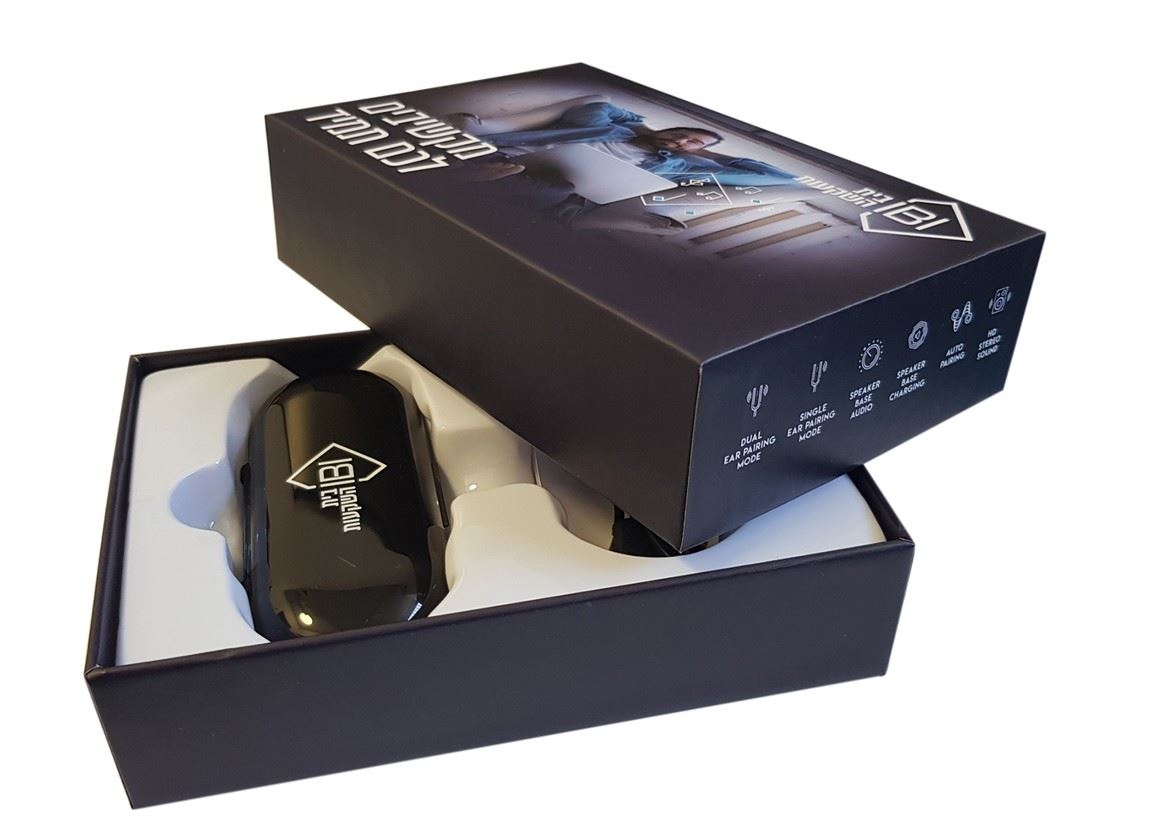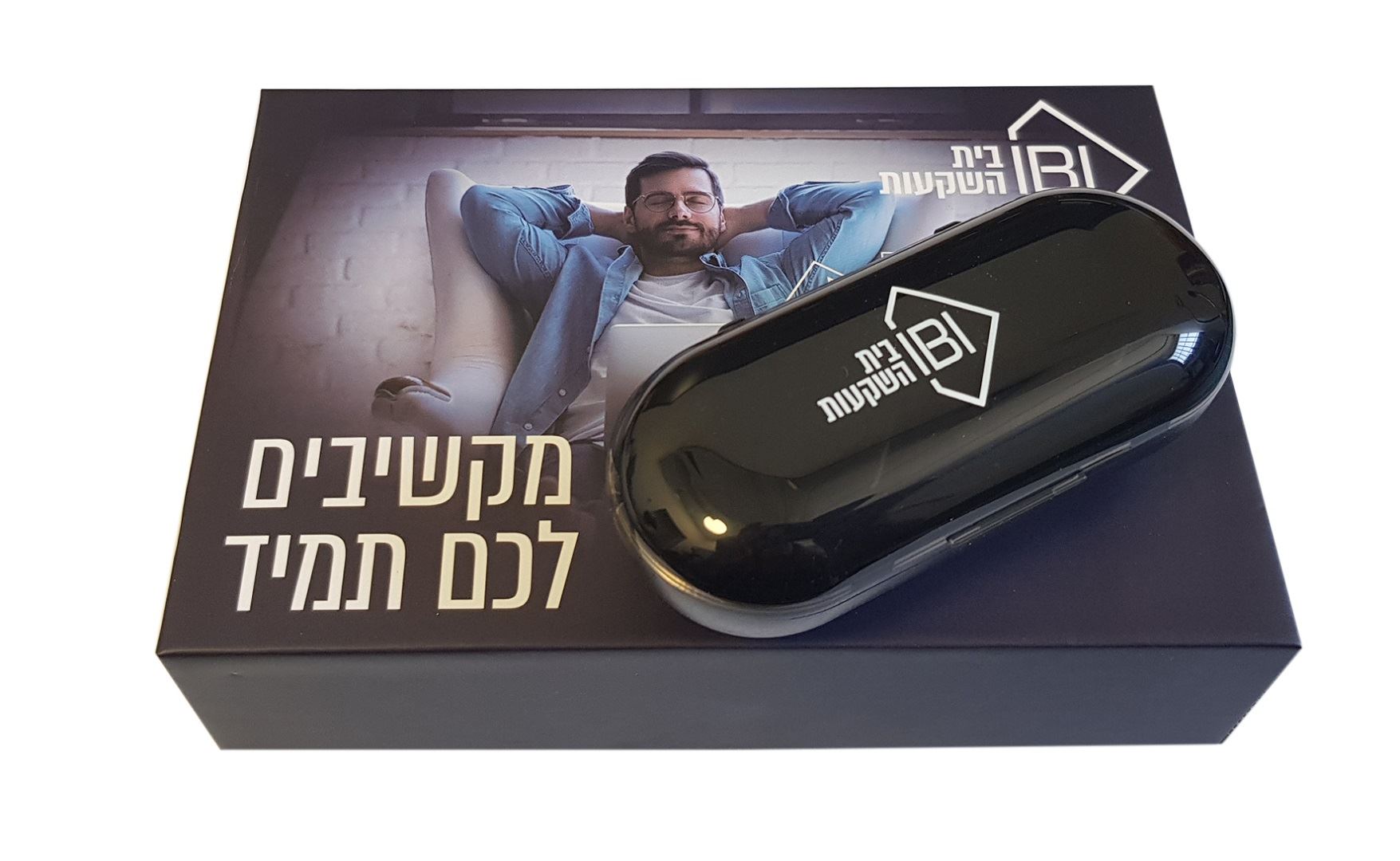 אוזניות בקופסה ממותגת של חברת IBI. ניתן לייצר אריזה מעוצבת וממותגת, בהתאם למיתוג של כל חברה.