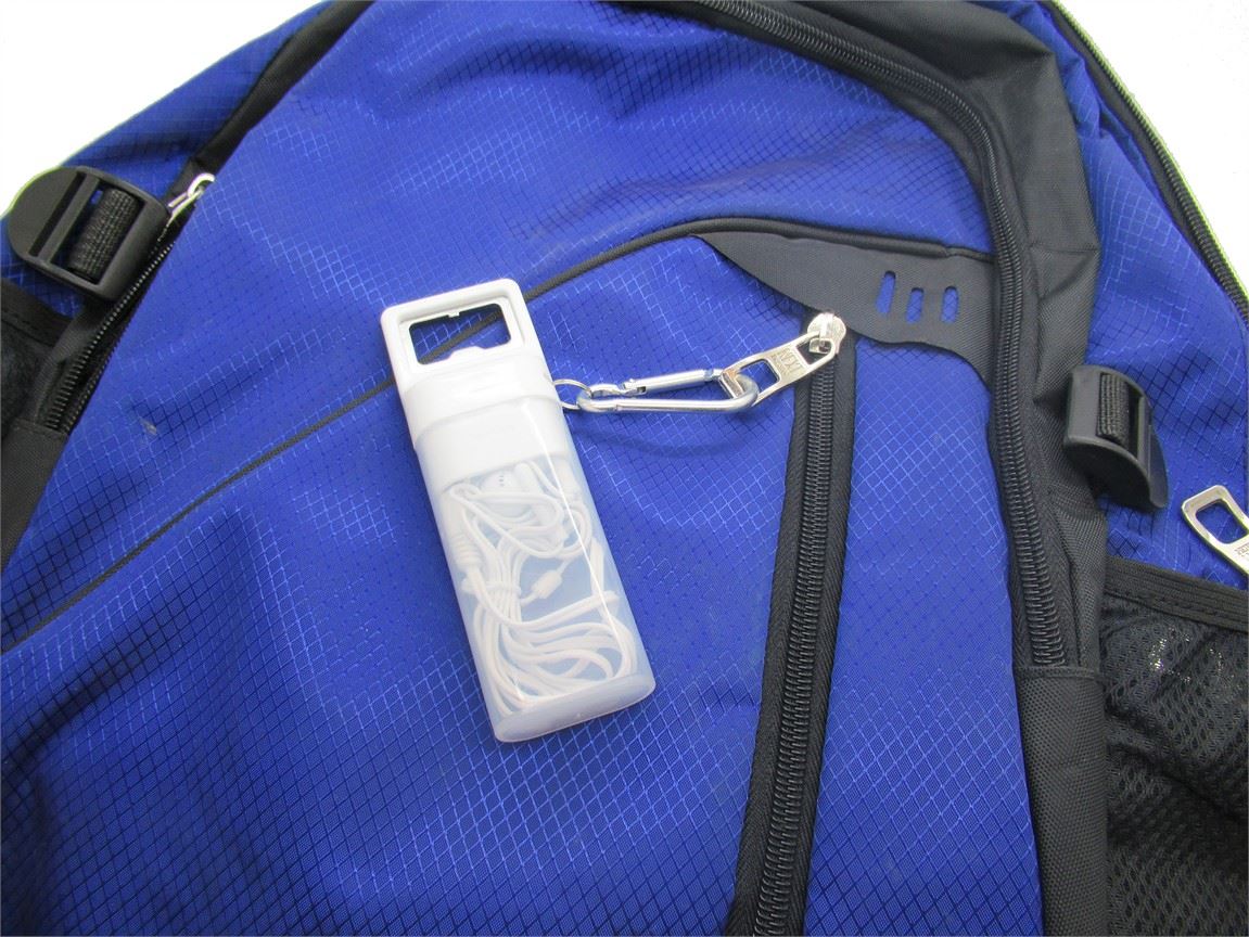 אוזניות במארז קפסולה שקוף. עם שאקל לחיבור הקפסולה לתיק. מכסה הקפסולה משמש גם כפותחן בקבוקים. אוזניות באיכות שמע גבוהה. נוח לנשיאה. גודל: 12X1.8 ס"מ