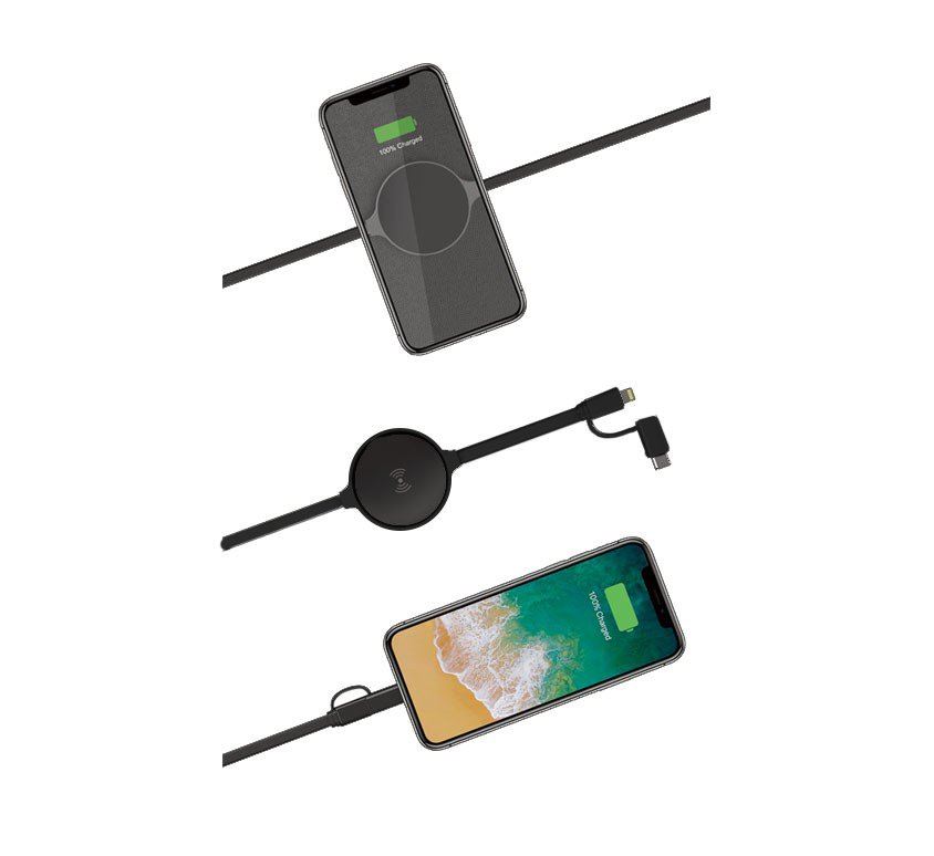 כבל טעינה מהיר 10W משולב- טעינה אלחוטית וטעינה רגילה חיבור ל- USB, יציאות טעינה לאייפון, אנדרואיד ו-TYPE- C אורך הכבל: 58x65.5x8.8 mm יציאה: 5V-2A מעטפת סגסוגת אלומיניום, כבל TPE שטוח ורך.