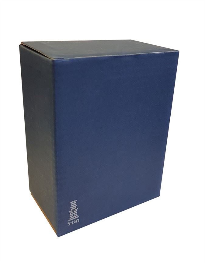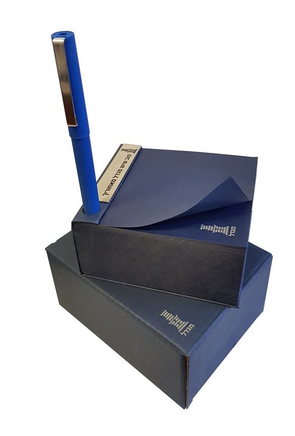 בלוק נייר ממו כחול הפקה מיוחדת לחברת מגדל. גודל: 10/90 ס"מ, 450 דפי ממו. לוחית מתכת צמודה עליה ניתן להדפיס/לחרוט. לכל בלוק מצורף עט רולר, כותב כסף.