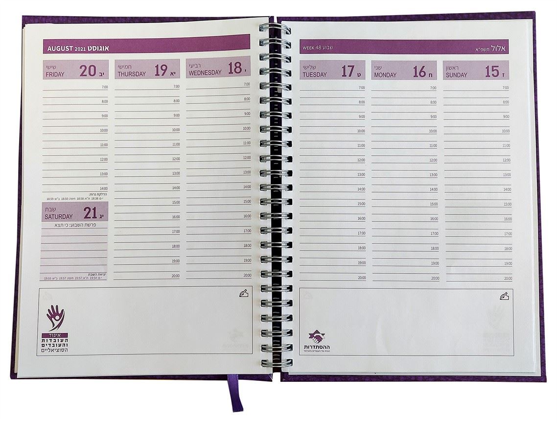 יומן שבועי יוקרתי ממותג. משולב פוייל כסוף וגומייה לסגירה. הפקה מיוחדת עבור ההסתדרות.
