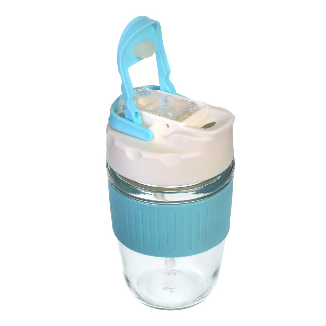 כוס זכוכית עם חבק סיליקון פיה לשתיה חמה וקש לשתיה קרה מכיל 400ML