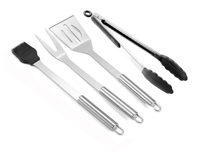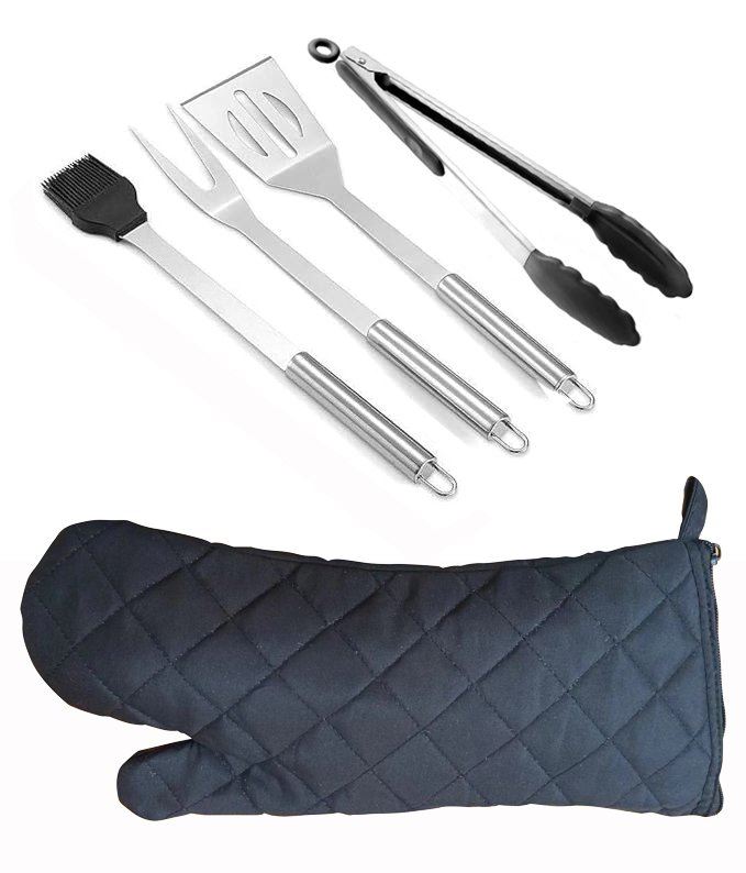 סט כלים למנגל/ברבקיו הכולל מזלג, מלקחיים, מברשת, מרית וכפפה. כלי הברביקיו עשויים ממתכת אל חלד עבה, ידיות ארוכות שעוזרות להימנע מכוויה.