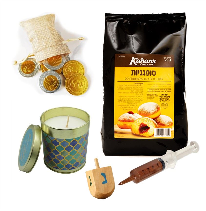 מארז אור מטבעות לחנוכה מכיל: תערובת להכנת סופגניות, מזרק ריבה/שוקולד, נר ריחני בקופסה מפוארת, חנוכיה ומטבעות שוקולד.