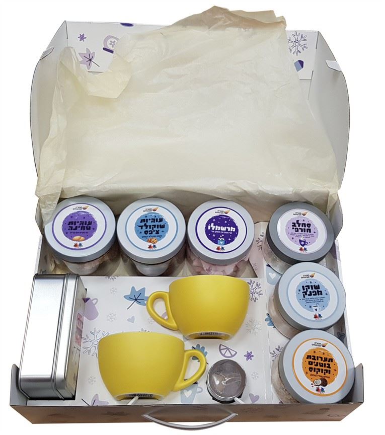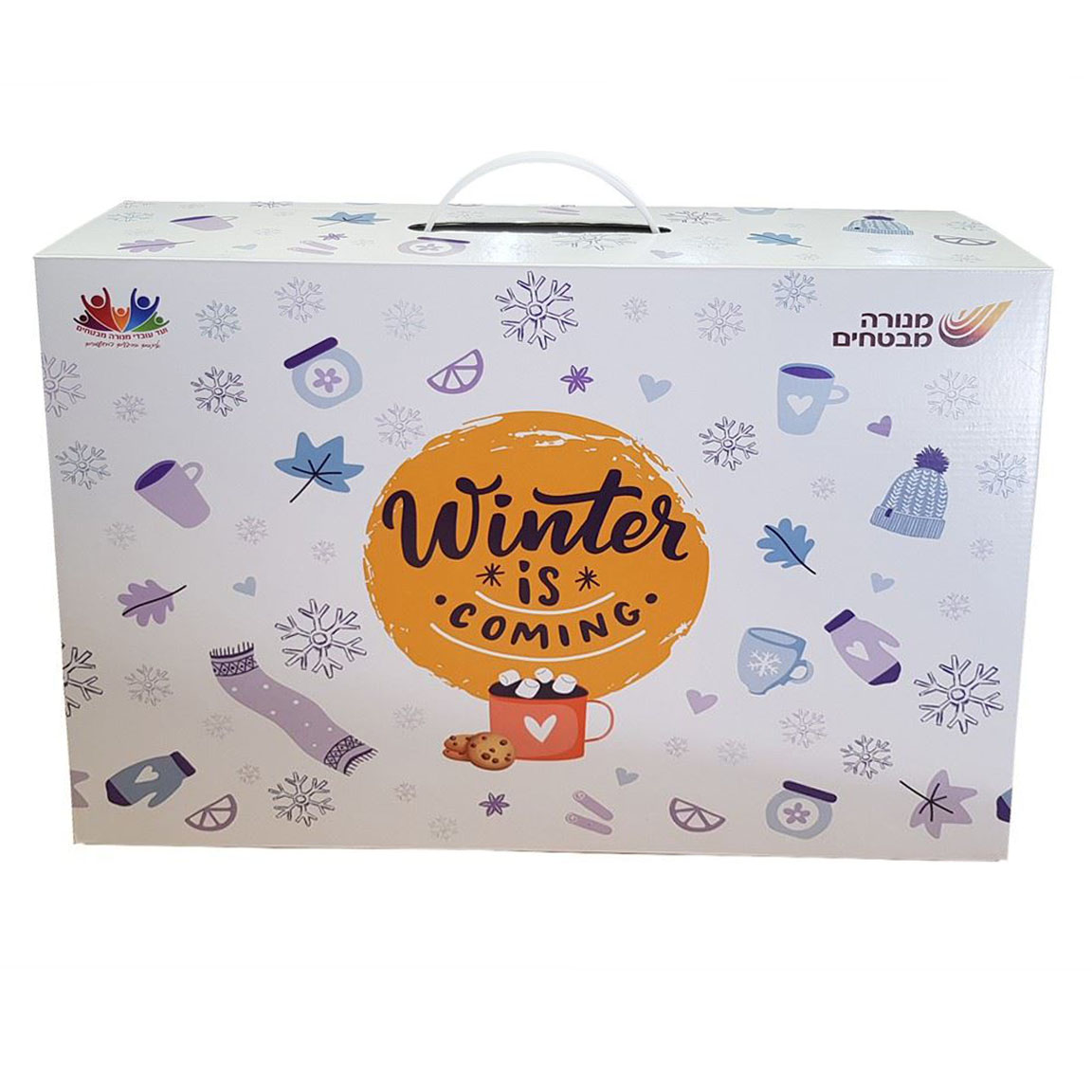 מארז חורף מפנק. הופק במיוחד עבור מנורה מבטחים. מכיל בתוכו: אבקות להכנת משקאות חמים עוגיות, תערובת בוטנים וקוקוס, קינמון וקופסת פח איכותית עם קלפי טריוויה. פינוק חם ללילה קר.