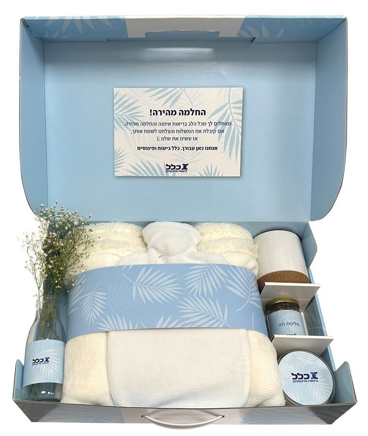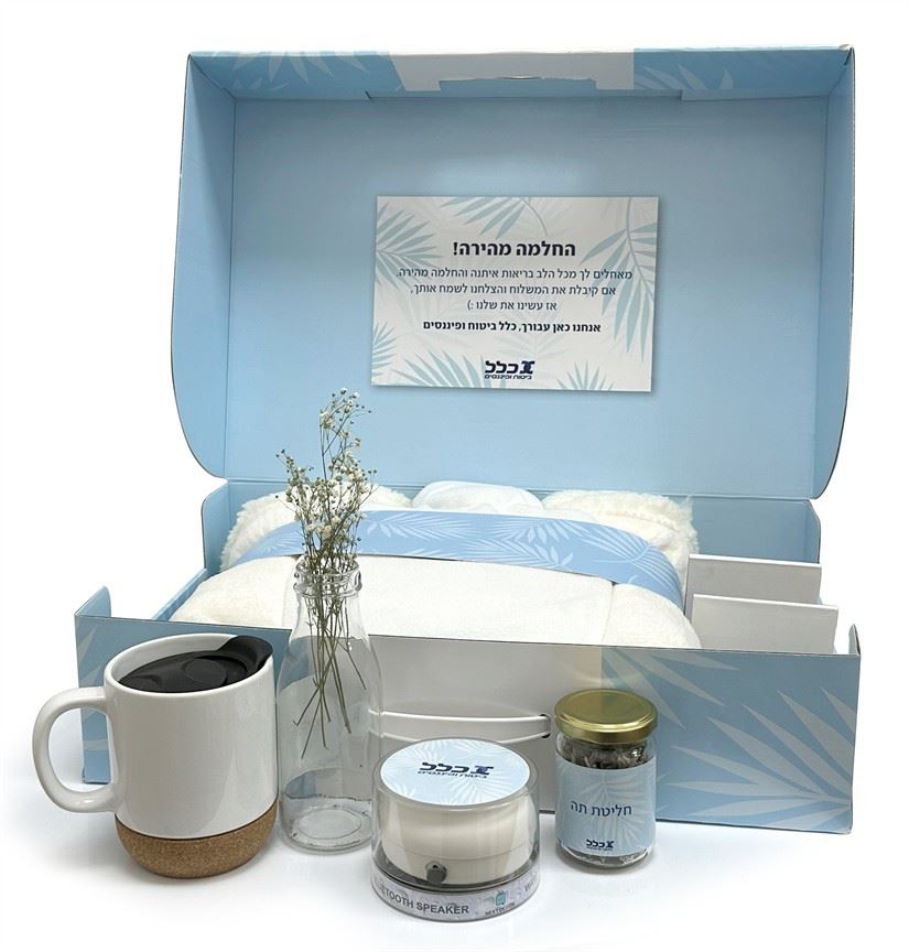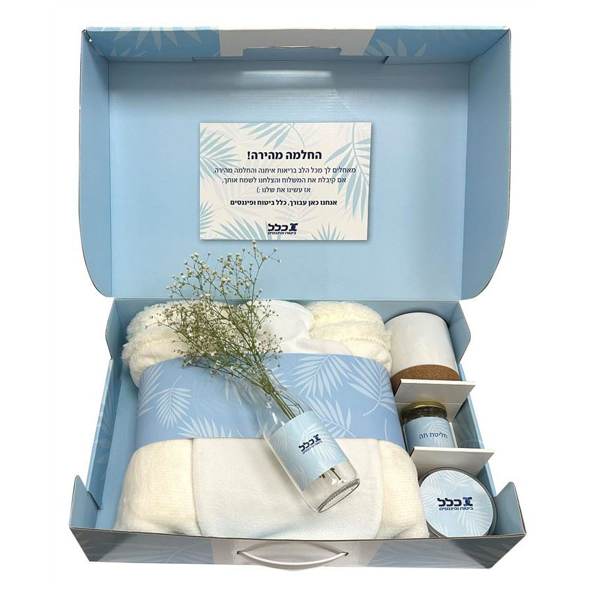מארז מתנה ארוז בקופסת מתנה ממותגת פרוצס מלא המארז מכיל שמיכה זוגית קורל רמקול בלוטוס חסין מים צנצנת עם חליטת מרווה ספל קרמיקה עם תחתית שעם בקבוק עם פרחי גיבסניות