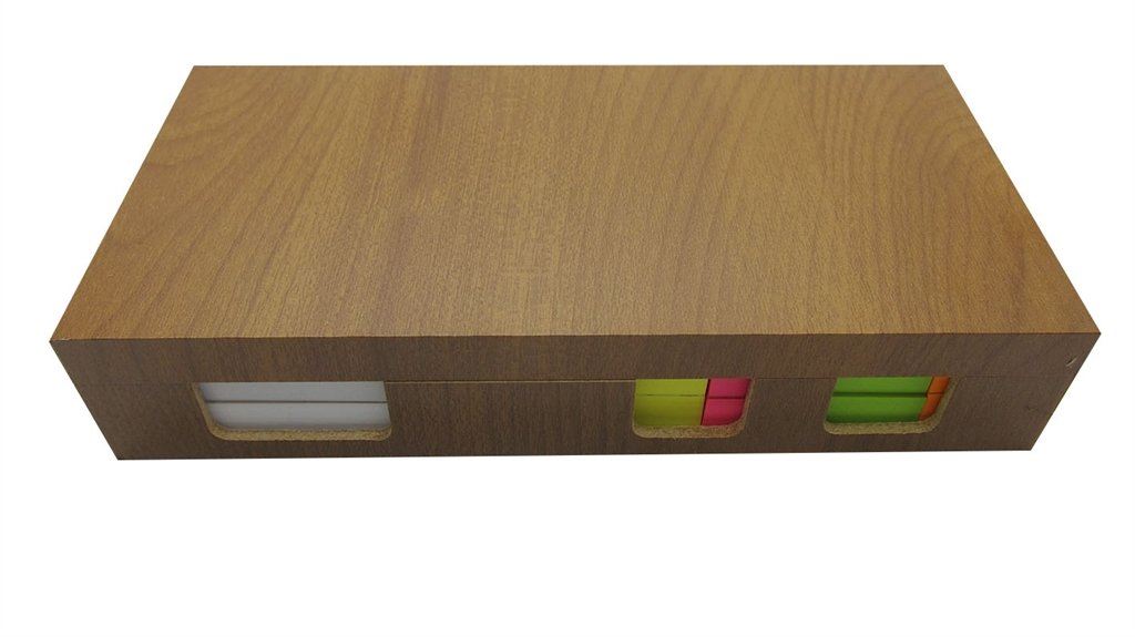 מארז מעוצב דמוי עץ, המאגד בתוכו ניירות ממו לבנים ודיגלונים צבעוניים לסימון, הנצמדים לנייר. ניתן למתג בהדפסה ע"ג המארז.