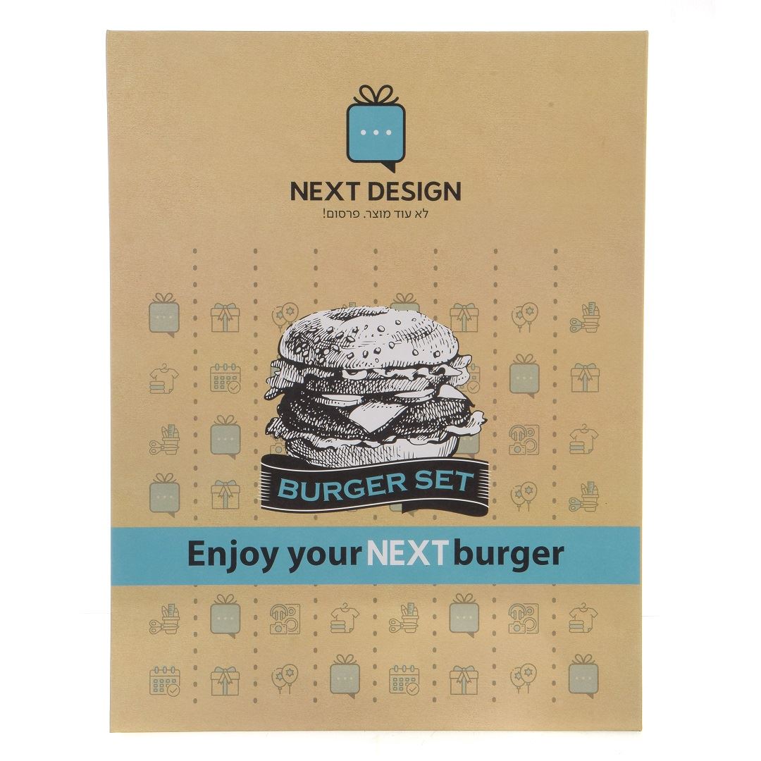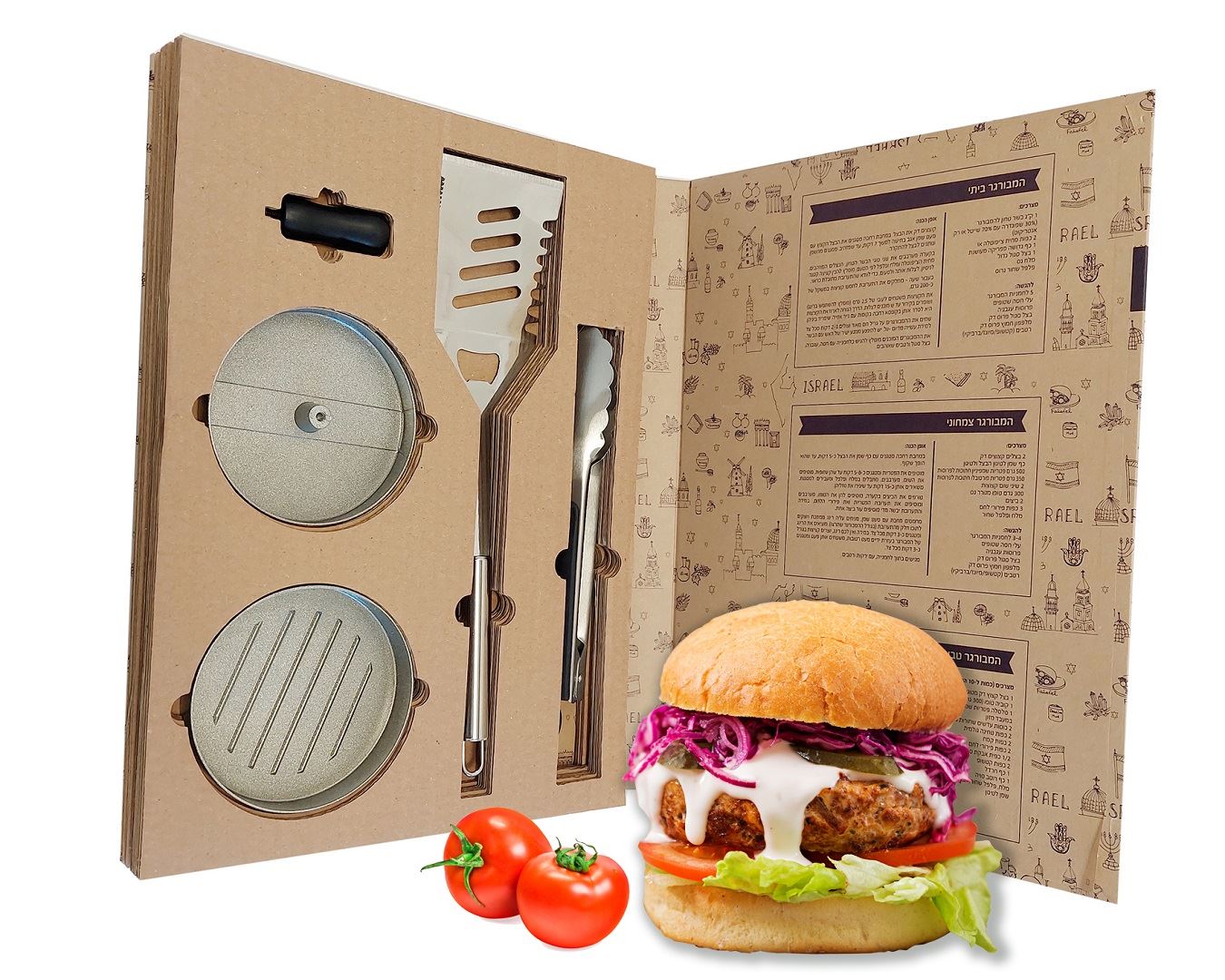 מארז להכנת המבורגר ביתי, קל להכנה ולתפעול. מניחים קציצת בשר בתבנית העגולה ודוחסים את הבשר, עם המכסה ליצירת קציצת המבורגר מושלמת. המארז מכיל: תרבד, מלקחיים, תבנית ומכסה. שלושה מתכונים להכנת המבורגר, מודפסים על גבי המארז. גודל המארז: 29x40 ס"מ ניתן לעצב בהתאם למותג הלקוח.