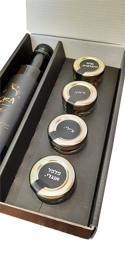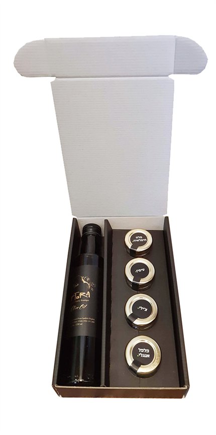 מארז שמן זית 250 מ"ל ו-3 צנצנות תבלינים ארוז בקופסא בעיצוב מיוחד עפ"י דרישת הלקוח