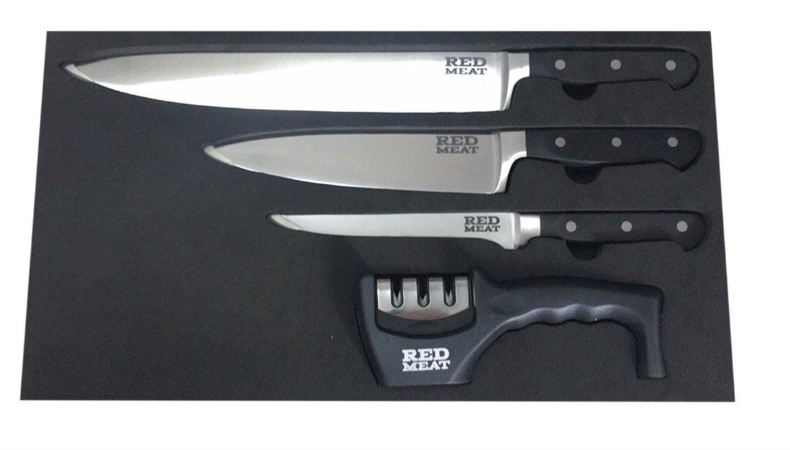 מארז סכינים בקופסה מפוארת שלושה סכינים בגדלים שונים ומשחיז סכינים. הפקה מיוחדת לרד מיט.