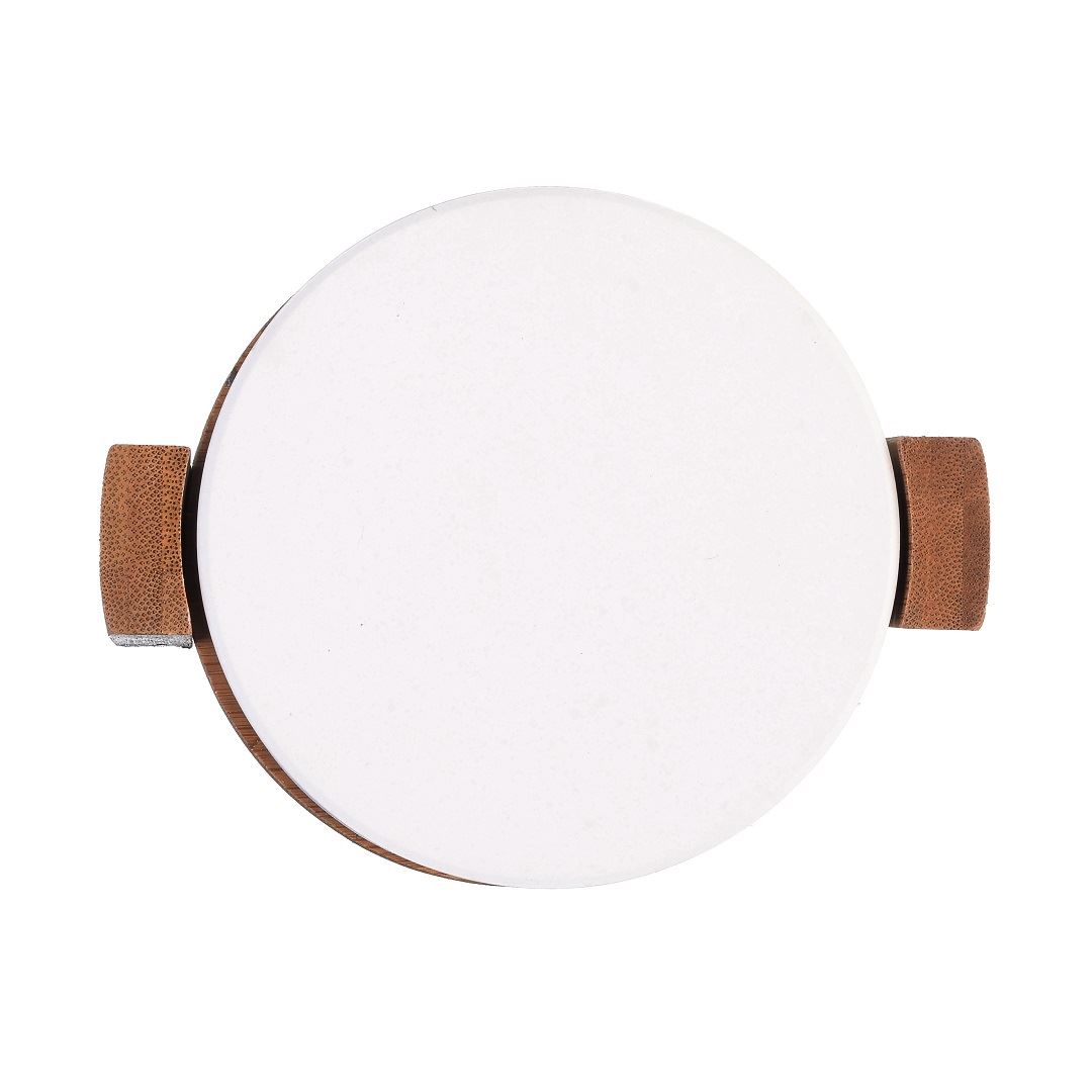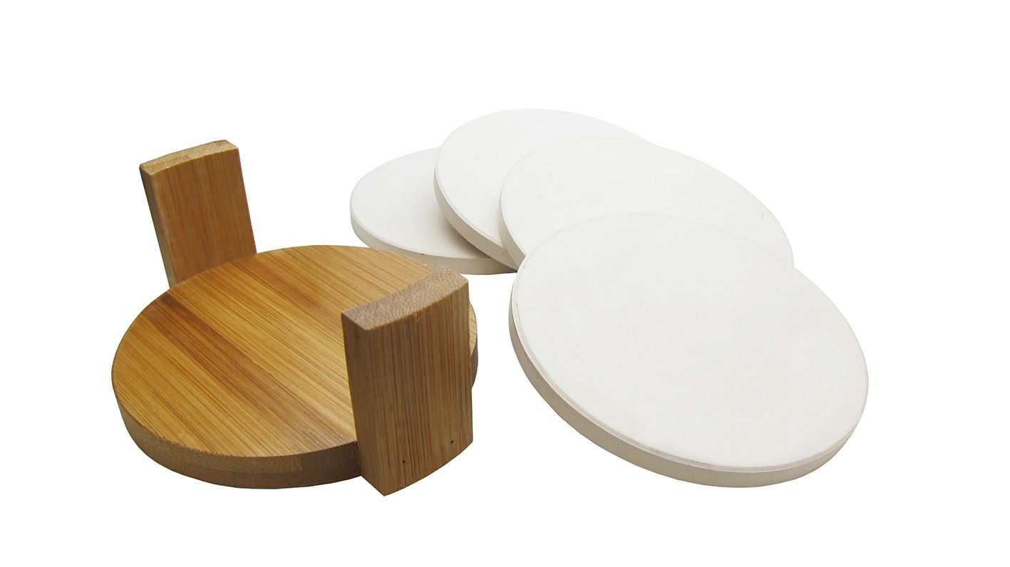 מארז תחתיות לכוסות עם סטנד מעץ, המאגד תחתיות גבס לבן, כולל שעם המוצמד לתחתיות, למניעת שיפשוף המשטח עליו מניחים אותן. ארוז בקופסה שחורה. גודל: 9 ס"מ