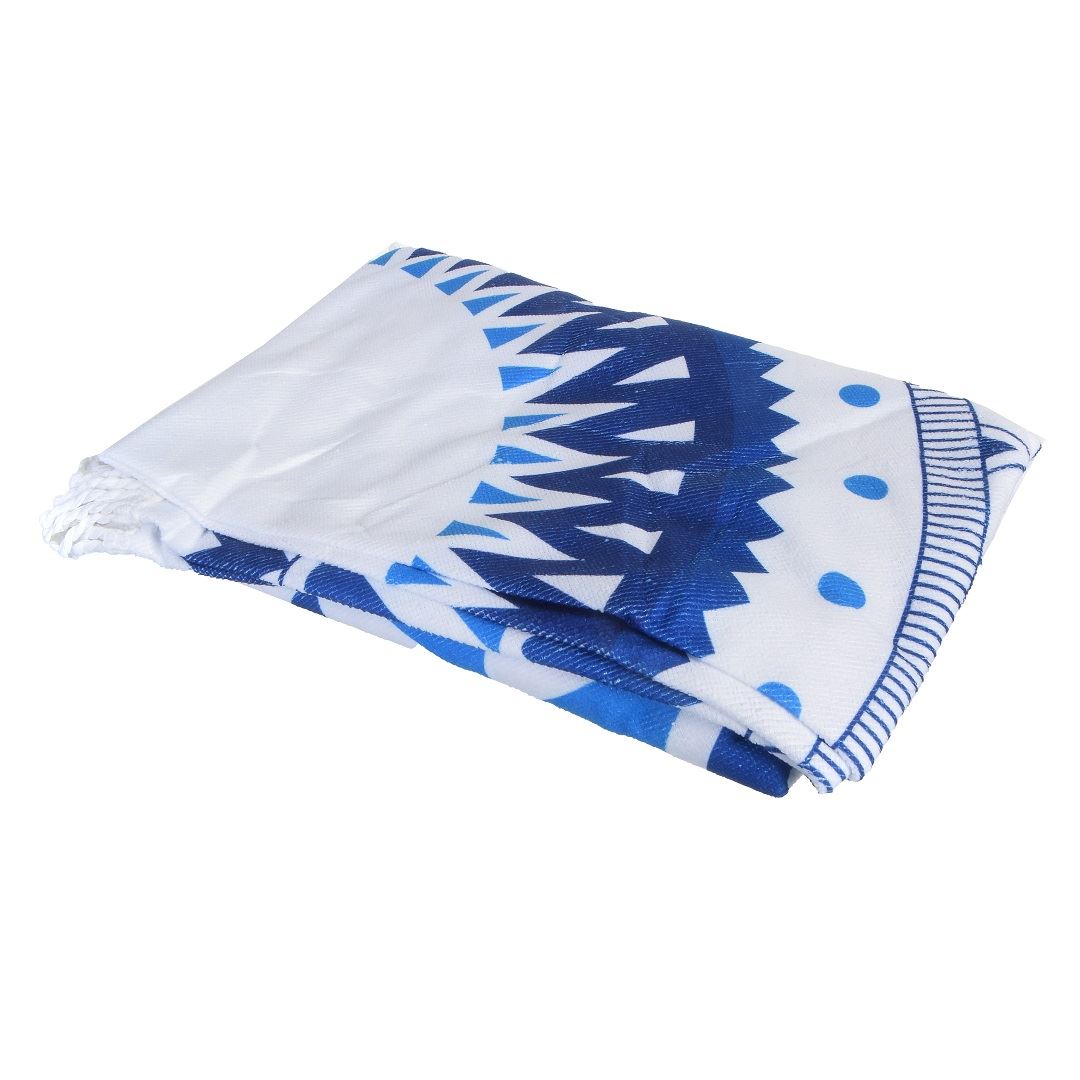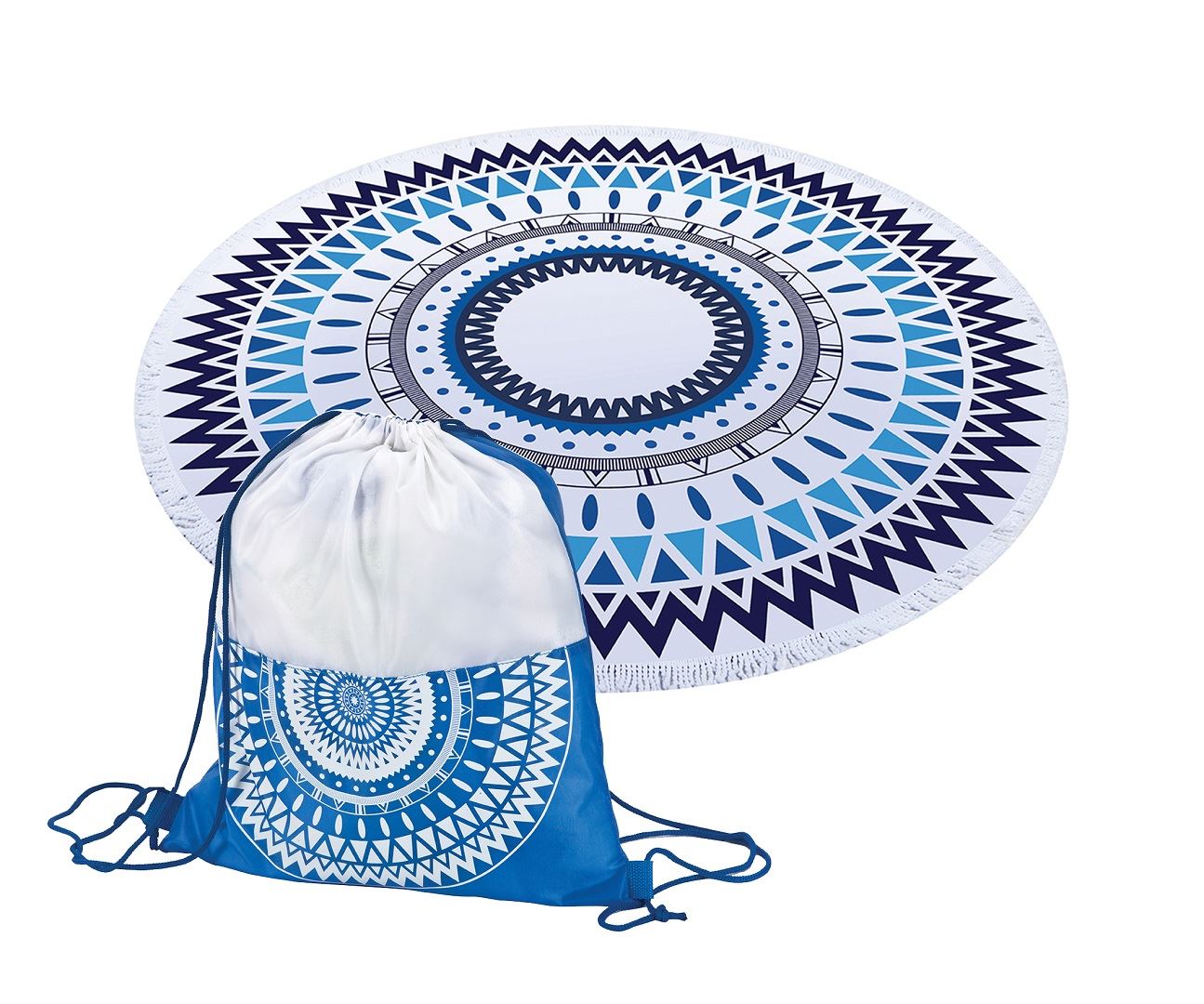 מגבת חוף עגולה+תיק גב שרוכים. מגבת מיקרופייבר 100% פוליאסטר 230 גרם, גודל 150 ס"מ. נארזת לתיק גב ניילון, עם שרוכים, לנשיאה על גב. ניתן למתג על התיק בהדפסה.