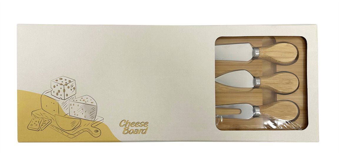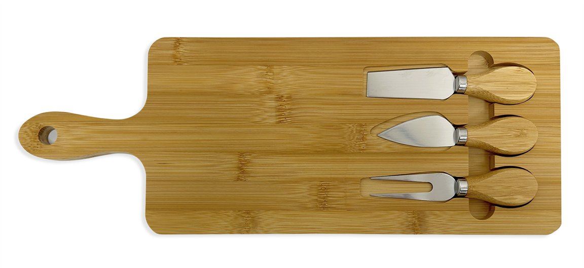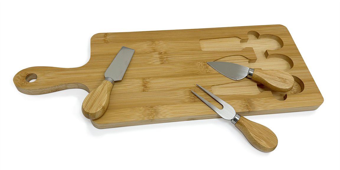 מגש הגשה/קרש חיתוך עם 3 סכינים לחיתוך גבינות יכול לשמש ככלי הגשה הקרש מעץ במבוק איכותי. גודל 42/15.5/1.3 ס"מ