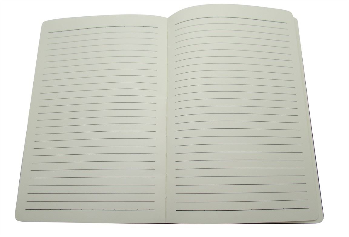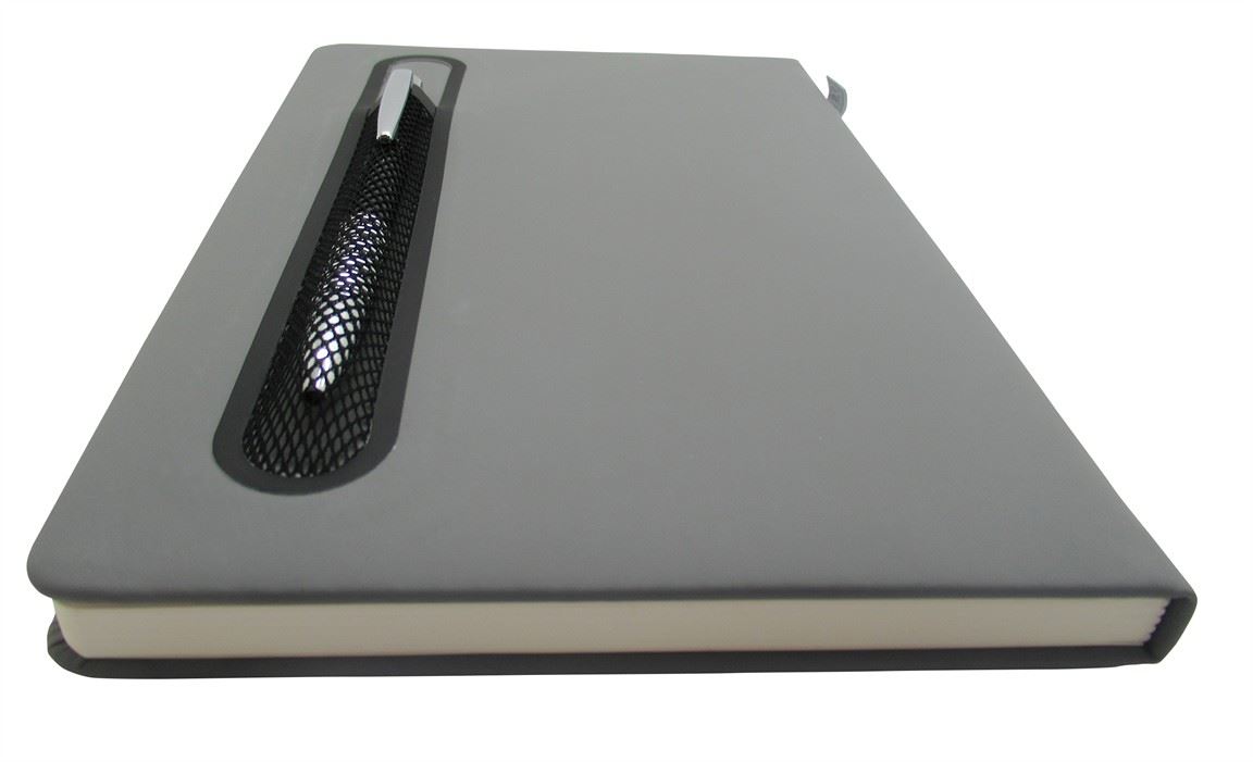 מחברת כריכת PU עם שרוול לעט בחזית, פתיחה עברית, עמודי שורה שני גוונים לבחירה.