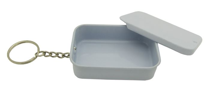 מחזיק מפתחות מקופסת פח במילוי סוכריות (ניתן לבחור בין מגוון סוגים.) ניתן למתג ע"ג הקופסא. מידות: אורך 5.8 ס"מ, רוחב 4.1 ס"מ. גובה 1.6 ס"מ. מארז: אריזת צלופן.