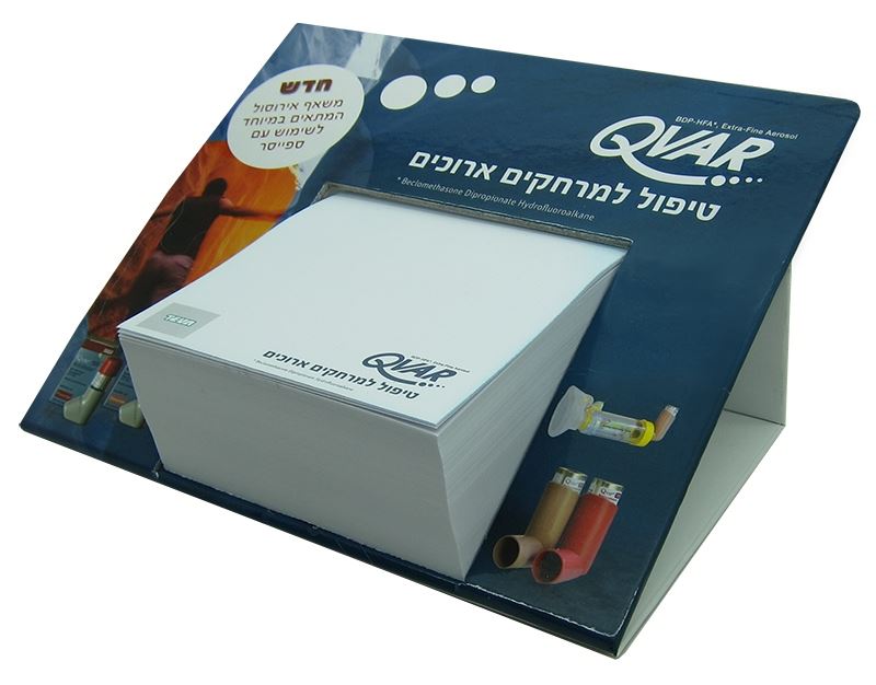 ממו שולחני אלכסוני בהפקה מיוחדת לכל לקוח. מכיל 400 ניירות ממו ממותגים