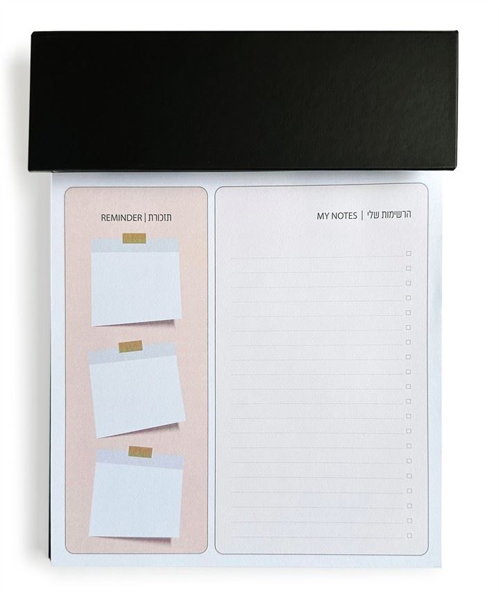 ממו-תכנון יומי המכיל - 100 דפי תזכורת/רשימות , נייר 80 גר' בגודל 175/175 מ"מ 150 דבקיות NOTE בגודל 50/45 מ"מ 150 דבקיות TO DO בגודל 50/45 מ"מ 5 דגלוני סימון ב- 5 צבעים שונים גודל המוצר- 235/175מ מ"מ ארוז בקופסא