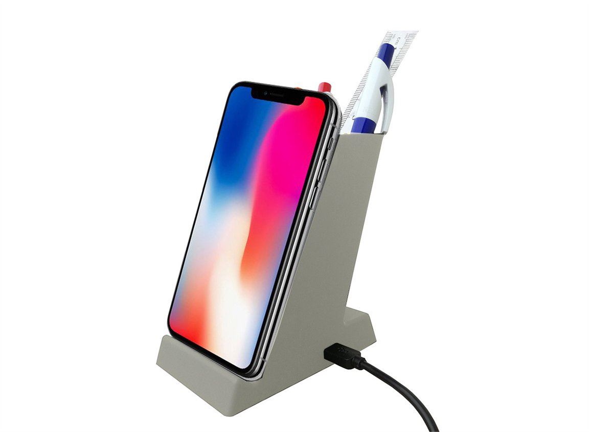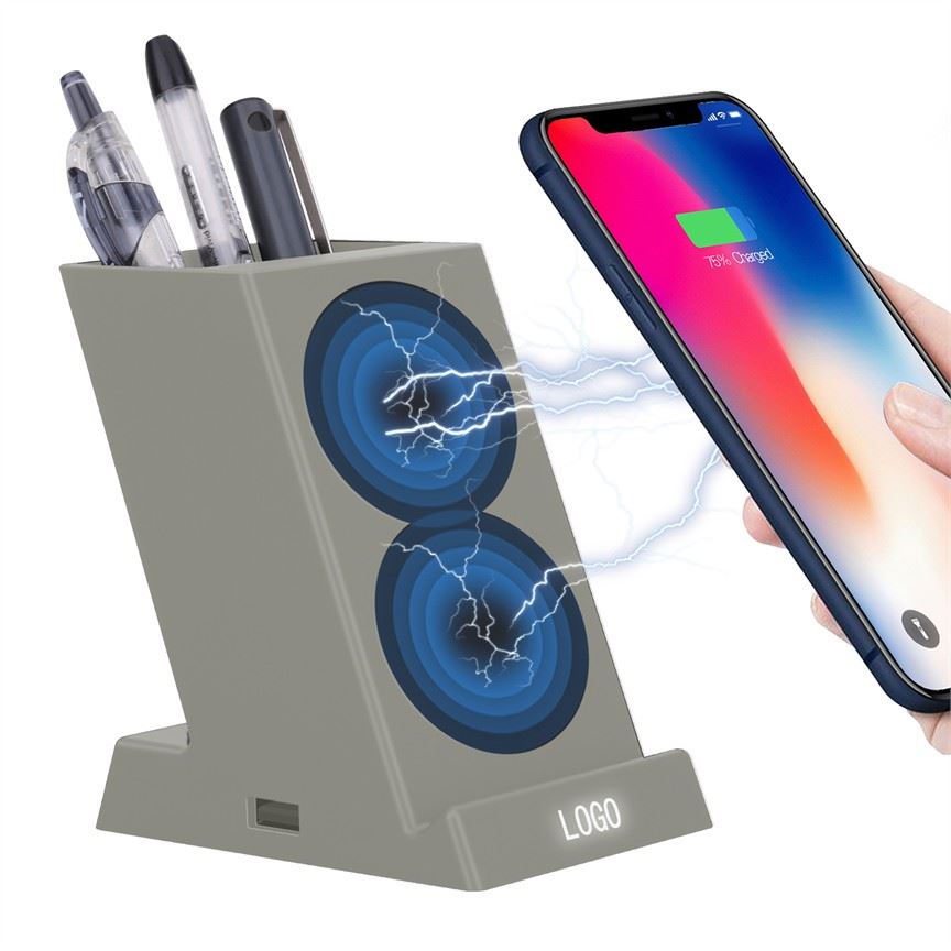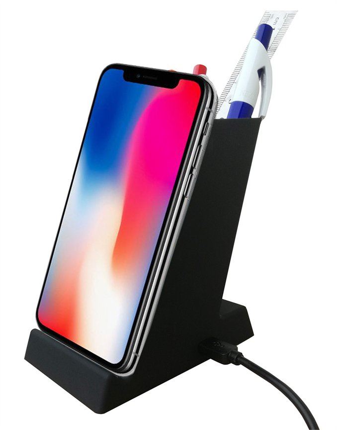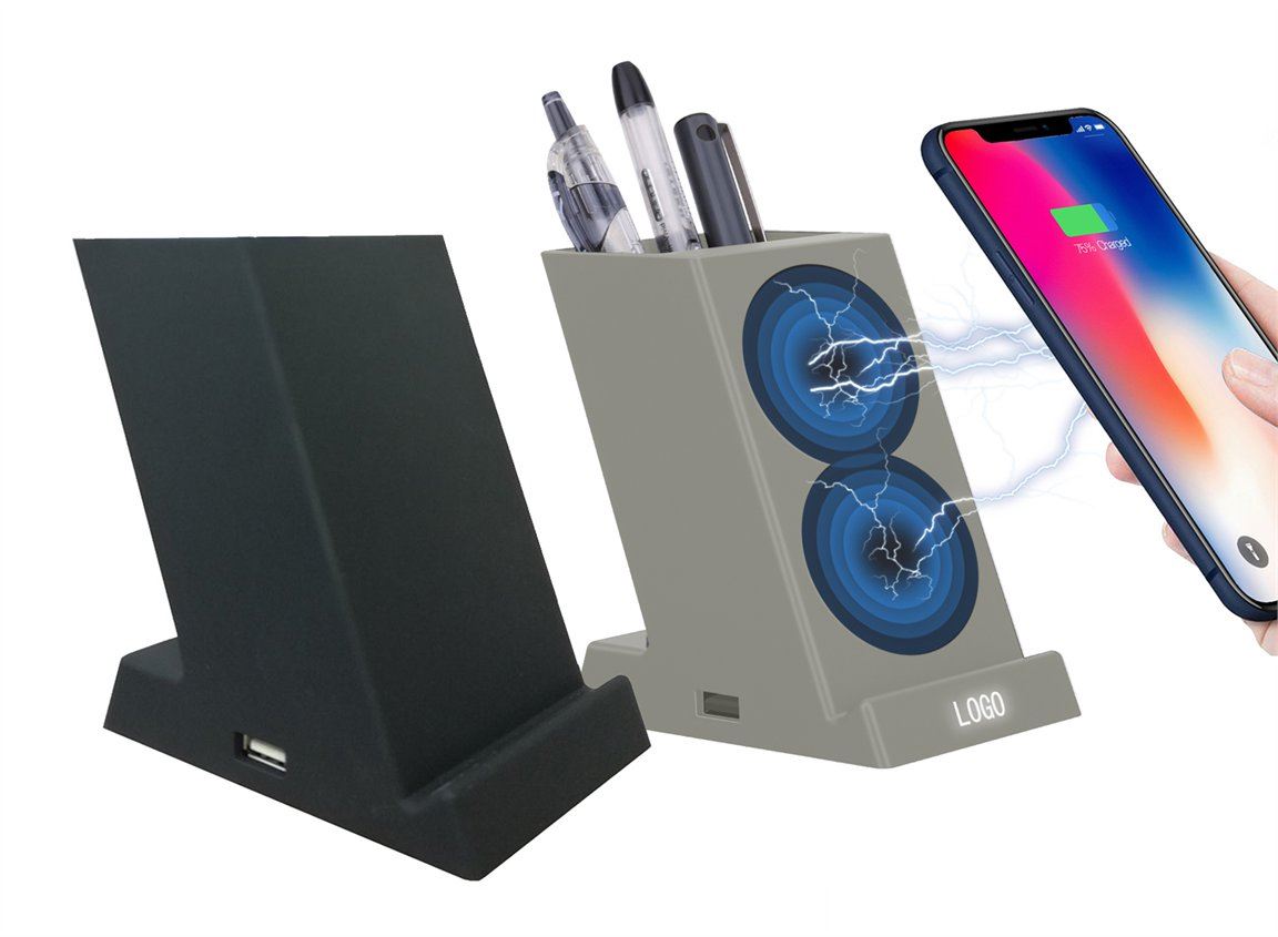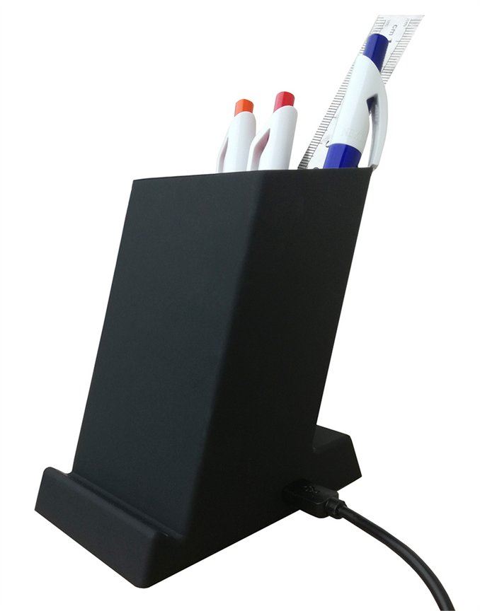 מעמד לעטים משולב מטען אלחוטי. ניתן להטעין טלפונים ניידים, התומכים בטכנולוגיית QI. כניסת מיקרו USB, יציאת USB. מניחים את הנייד ע"ג איזור הטעינה והמטען יטעין את הנייד באופן אוטומטי. מגיע במארז קרטון שחור. ניתן למתג ע"ג המוצר בהדפסה. גודל: 110x90x65 mm