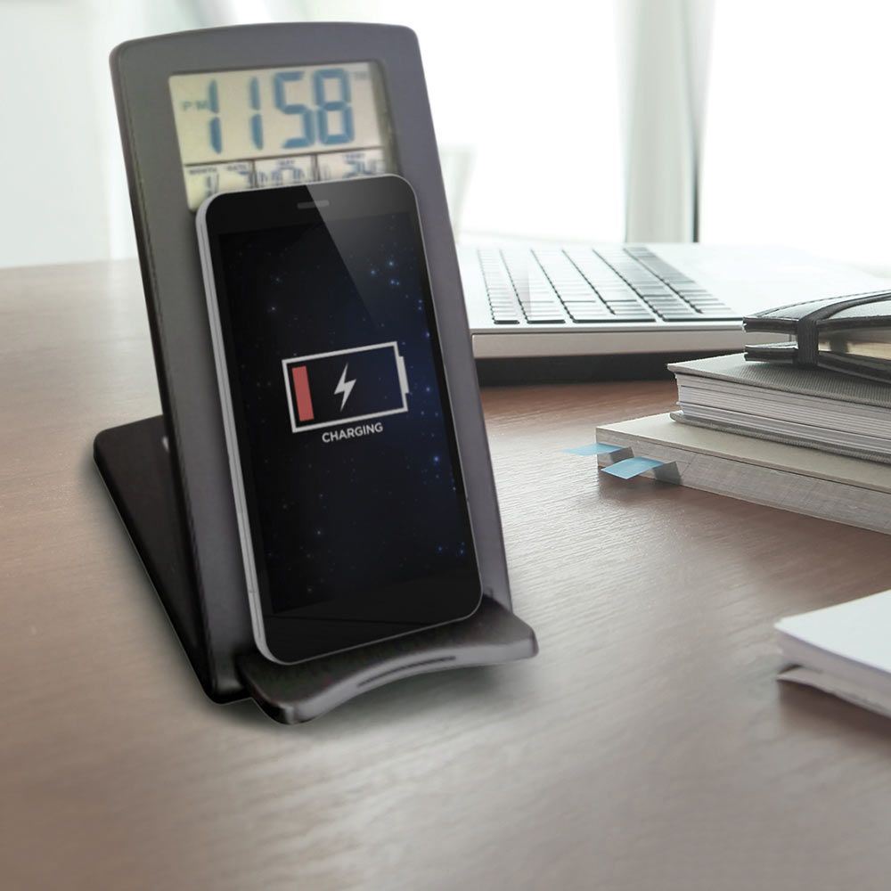 מעמד לנייד, מטען אלחוטי ושעון דיגיטלי במוצר אחד.