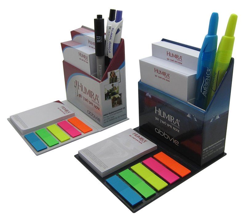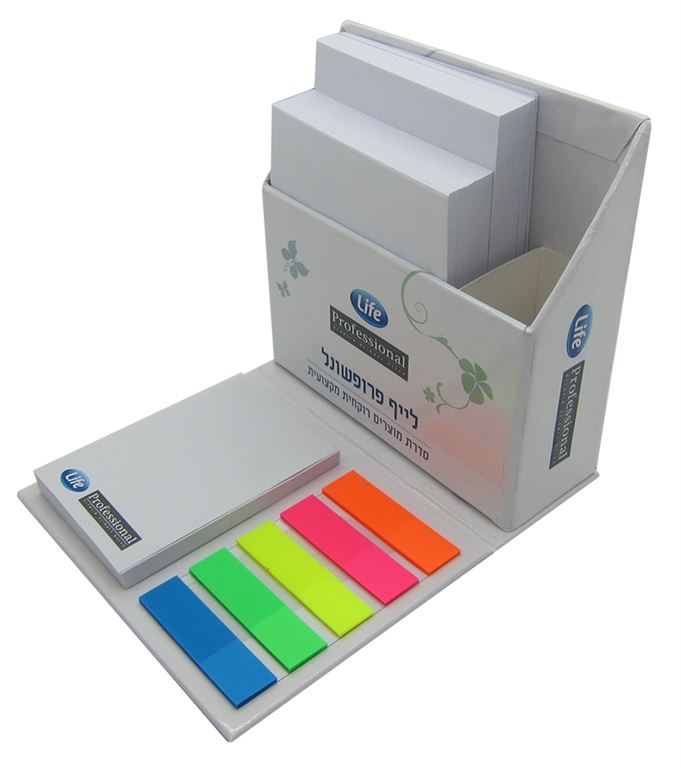 מכיל: דגלוני סימון ב 5 צבעים נייר ממו דביק בגודל 7.5*5 ס"מ כ-50 דף ניירות ממו ב 2 קומות : קומה תחתונה נייר ממו בגודל 9*7.5 ס"מ כ 120 דף. קומה עליונה נייר ממו בגודל 10.50*7.5 ס"מ כ 120 דף.