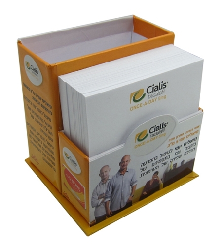 מעמד שולחני לדפי ממו ועטים הפקה מיוחדת לכל לקוח גודל: 9x9x8 ס"מ 350 דפי ממו ממותגים