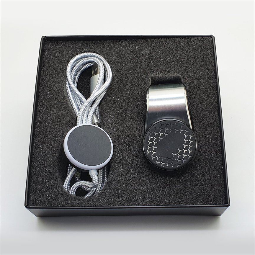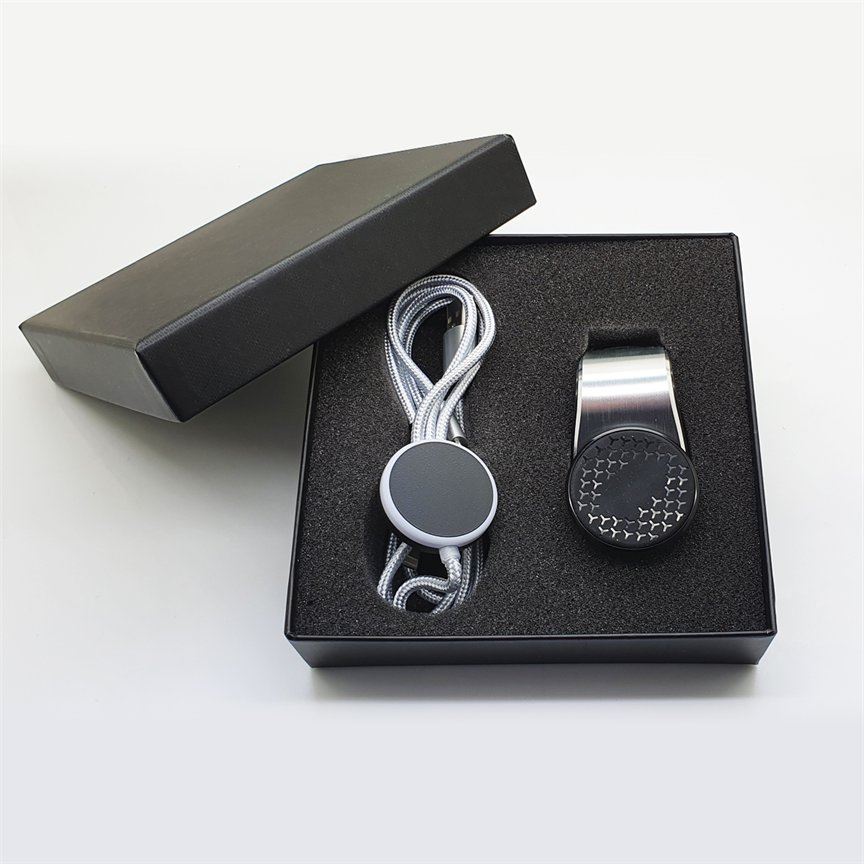 ערכה לרכב הכוללת: מגנט לרכב עם ראת מתכוונן, למכשירי טלפון ניידים, בעל עיצוב מיוחד וקומפקטי. ניתן למיקום על רפפת המזגן. גודל: 63x37x10 mm. כבל טעינה איכותי לטלפון נייד, חיבור USB ויציאות טעינה לאייפון, אנדרואיד ו-TYPE- C אורך: 1.20 מטר ניתן לחריטת לוגו ע"ג הבסיס העגול והתוצאה לוגו מואר.