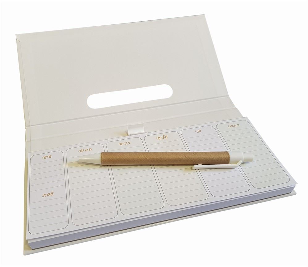 פנקס ממו תכנון שבועי. בלוק של 100 דפים נתלשים, כאשר בכל דף טבלת תכנון שבועי, עם מקום לרישום משימות חשובות, הגדרת מטרת השבוע, פגישות או פרויקטים שעליכם לבצע או להגיש. לפנקס צמוד עט לרישום המשימות. גודל: 10.5x21 ס"מ ניתן למתג בהדפסה.