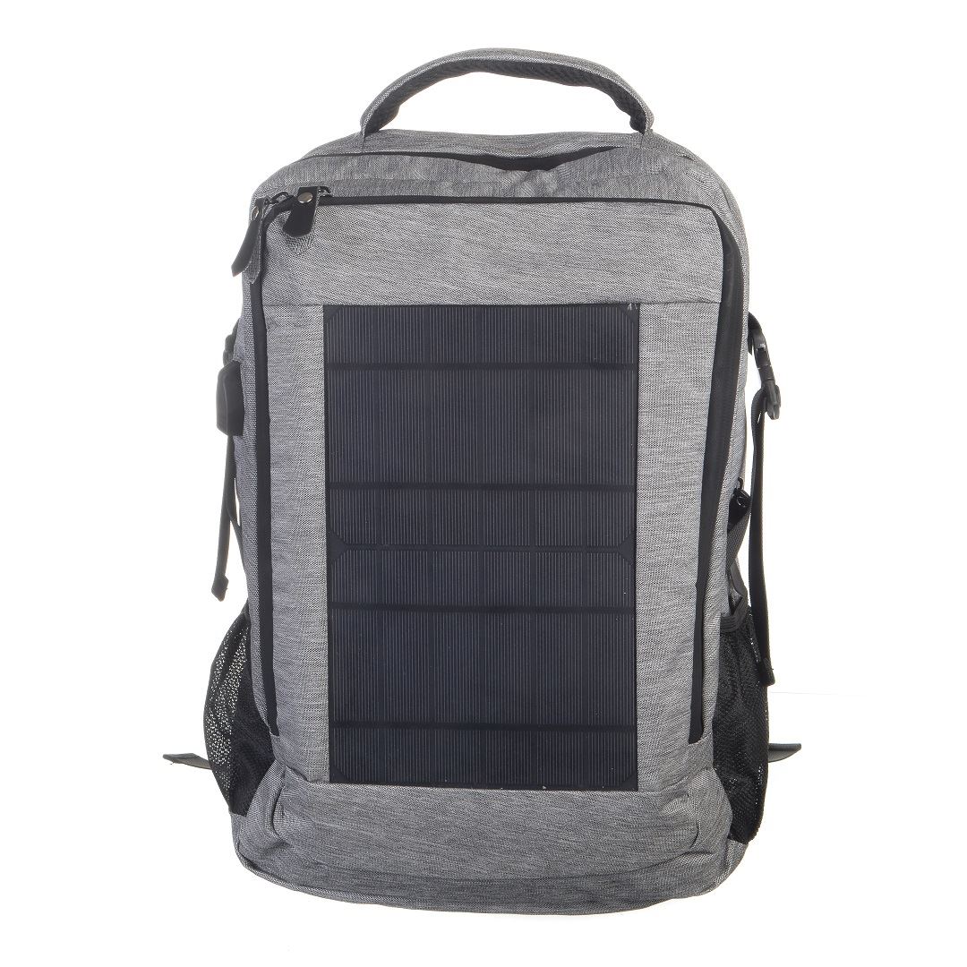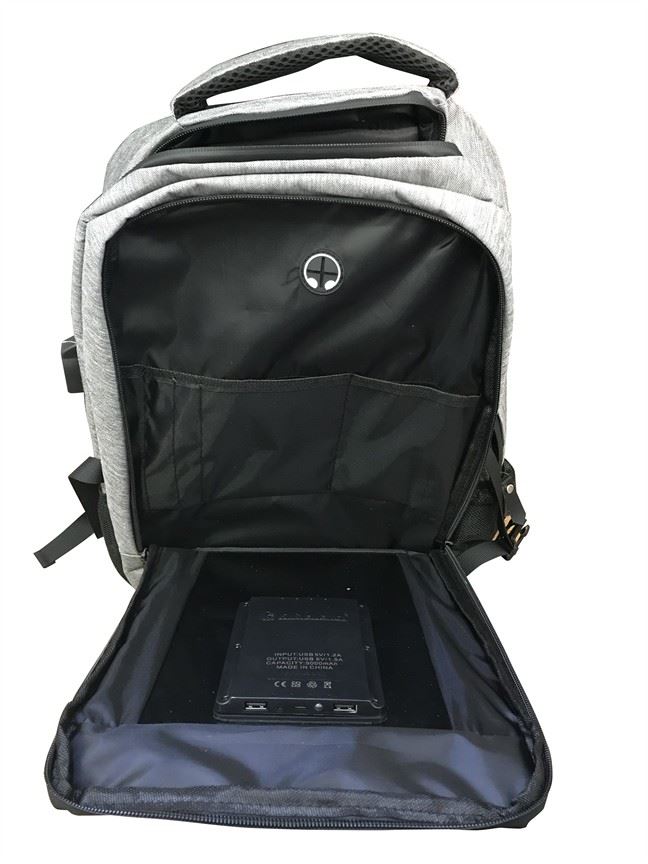 תיק גב למחשב נייד, אורטופדי. יש בו סוללת גיבוי 5,000 מילי אמפר, היכולה להטען מנקודת חשמל או באופן סולארי. הסוללה עם 2 כניסות USB. ניתן למתג בהדפסה.
